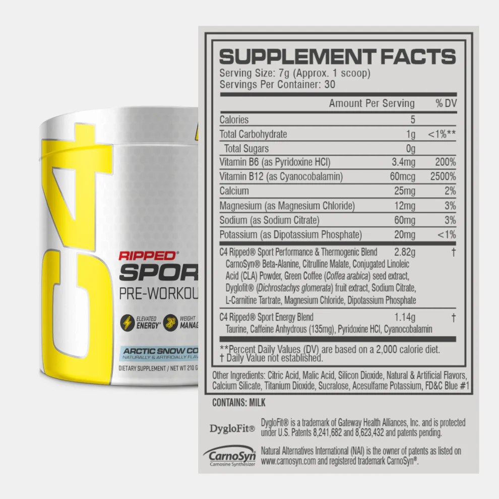 Burn fat without sacrificing training performance with the new C4 Sport Ripped™! Made with 200mg of caffeine, C4 Sport Ripped™ powers every workout with hard-hitting energy. 2g of CarnoSyn® Beta-Alanine enhances muscular endurance to fight fatigue and keep you training harder than ever! And finally, the fat-burning combination of Cayenne Extract, L-Carnitine Tartrate, and Bioperine® Black Pepper Seed Extract turns up the heat to break down fat and burn more calories. For a pre-workout that redefines physique and performance, fuel your training with C4 Sport Ripped™!