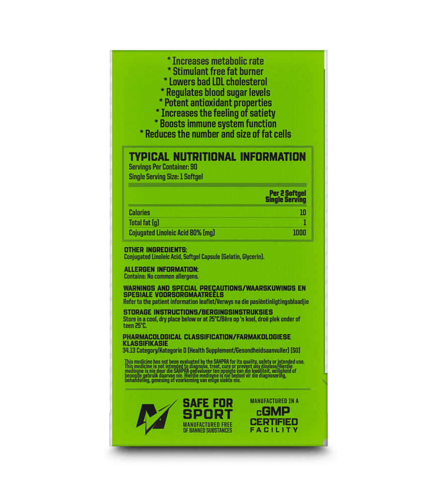 An exceptional choice for those for on advanced training programmes looking to improve body composition. THERMOTECH CLA 1000 combines the potential benefits of cojugated linoleic acid to bring you an easy to swallow softgel suitable for anytime of the day and designed to positively influence your weight management programme, which includes regular exercise and an energy-restricted diet.