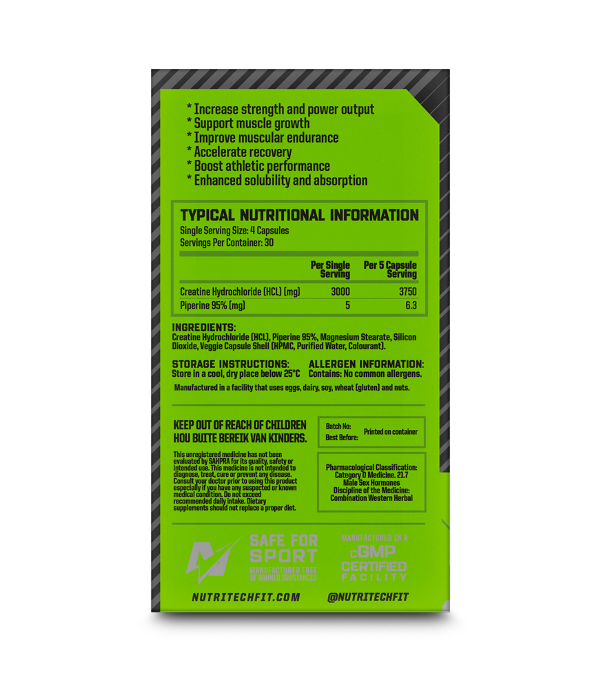 NUTRITECH Creatine HCL capsules are a highly effective supplement designed to increase muscle strength, power, and endurance. Made with pure creatine hydrochloride, these capsules offer quick absorption and improved solubility, making them a perfect choice for athletes and bodybuilders.