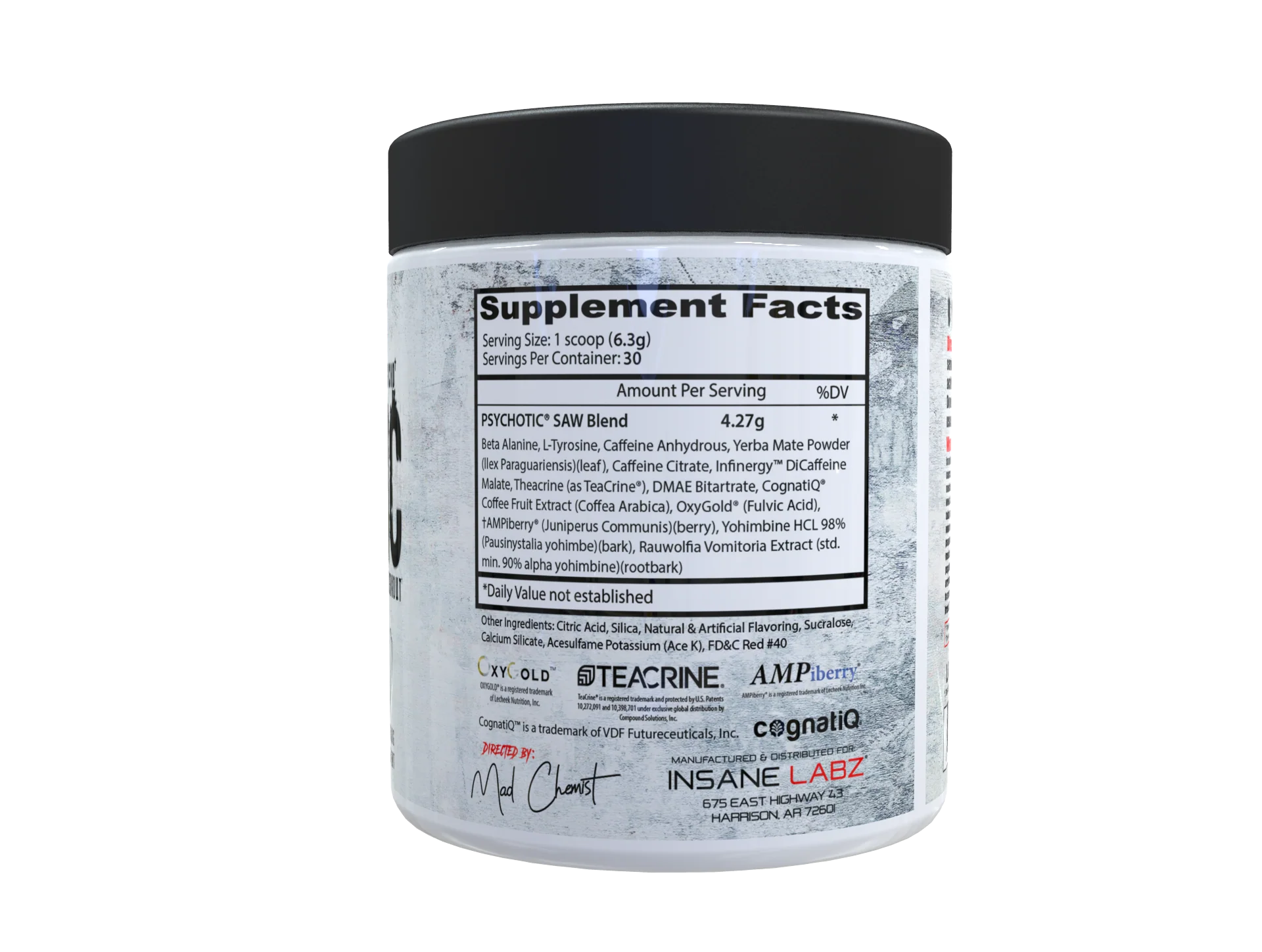 Psychotic SAW is the most INSANE pre-workout ever made by the Mad Chemist and his team at Insane Labz. They’ve packed the formula FULL of ingredients that work together to give you everything you need to KILL it in the gym! Below, expand each of these ingredients to learn what makes Psychotic SAW different than any pre-workout you’ve ever tried!