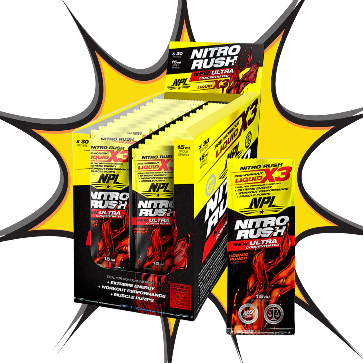 Nitro Rush Sachets deliver a powerful pre-workout formula in a convenient, portable sachet. Packed with energy-boosting and nitric oxide–enhancing ingredients, it helps increase blood flow, improve muscle pumps, and sharpen mental focus. Perfect for athletes and lifters on the go, Nitro Rush ensures you’re fueled for every session, enhancing endurance, performance, and workout intensity. Just mix, drink, and feel the rush, anytime, anywhere.