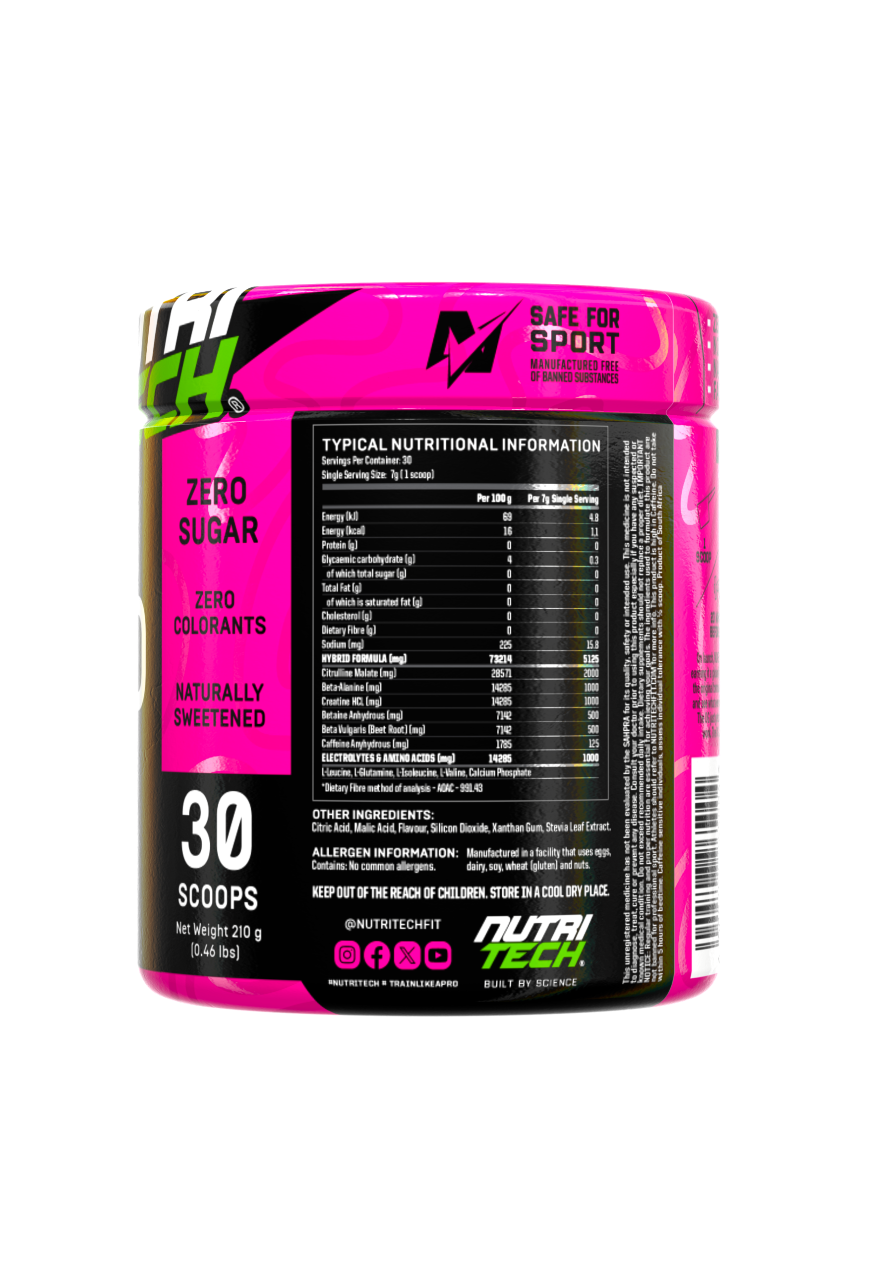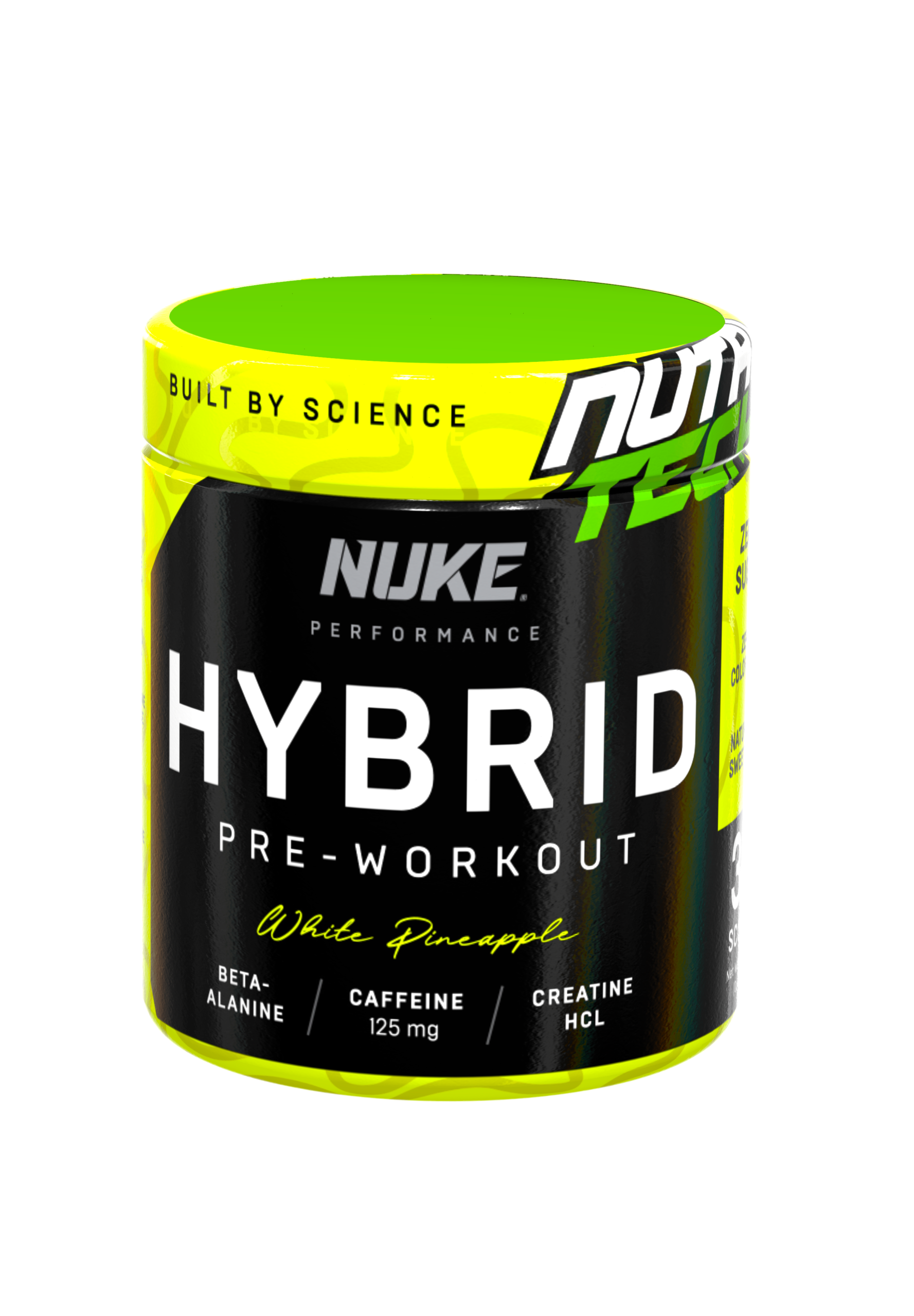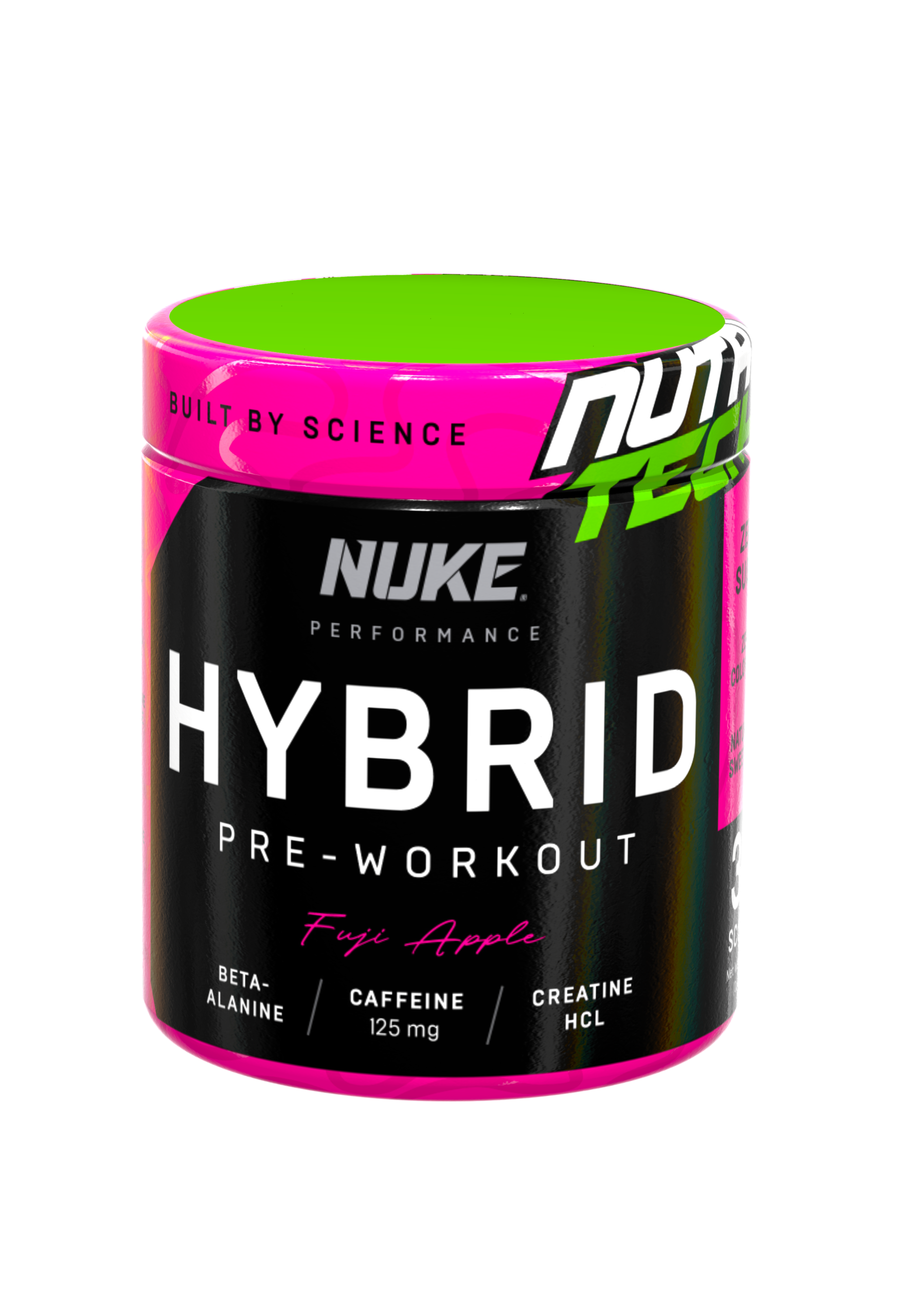 NUKE HYBRID is built for all-out training, with zero crash. One scoop powers high-intensity sessions with clean focus and smooth energy from 125mg caffeine. Need more? Double scoop and bring on the chaos with 250mg caffeine for strength-focused sessions when the pace slows and the weights get heavy. Whether you’re lifting, running, racing, or cross training, NUKE HYBRID adapts to your training style.
