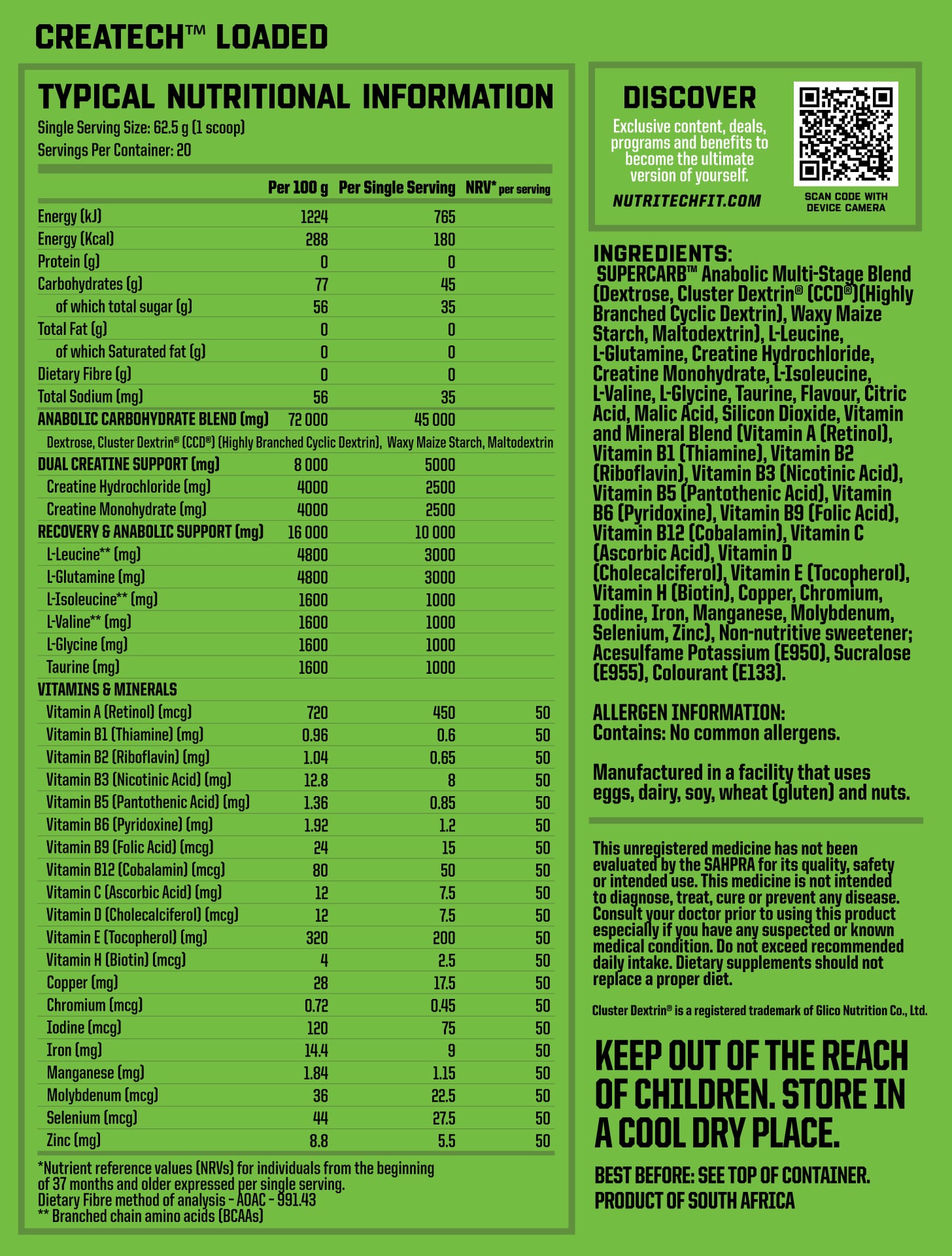 Createch Loaded is a powerful creatine supplement that helps to boost strength and muscle performance, while also providing a nutrient transport system to aid in muscle recovery and growth. With added amino acids, vitamins, and minerals, this supplement is ideal for those looking to take their training to the next level.