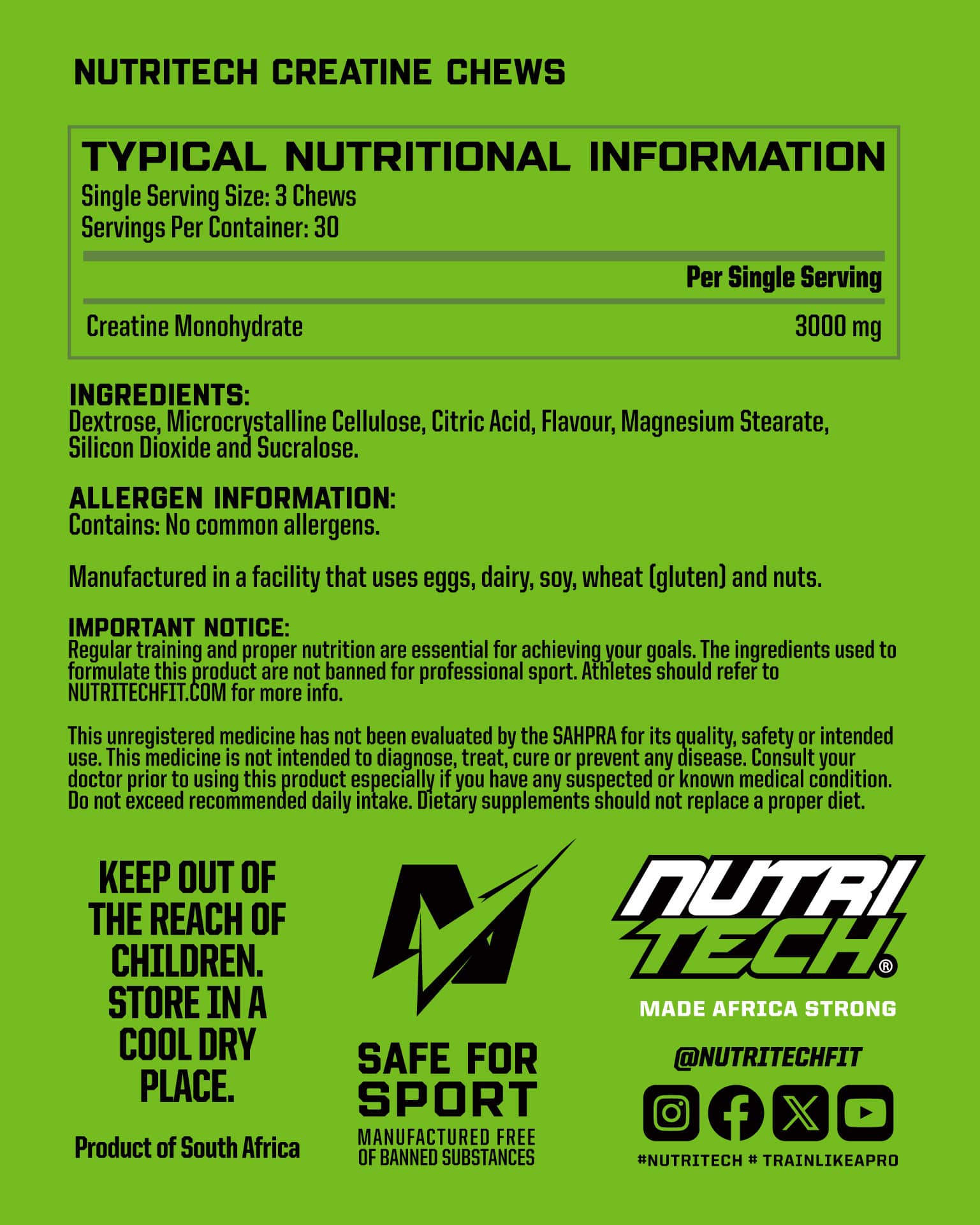 NUTRITECH Creatine Chews, your on-the-go strength and performance booster. These convenient chews are packed with 5g of pure creatine monohydrate per 5 chews, providing the fuel you need, wherever you are. Just toss them in your gym bag, leave them in the car, or stash them in your locker for quick and easy access.
