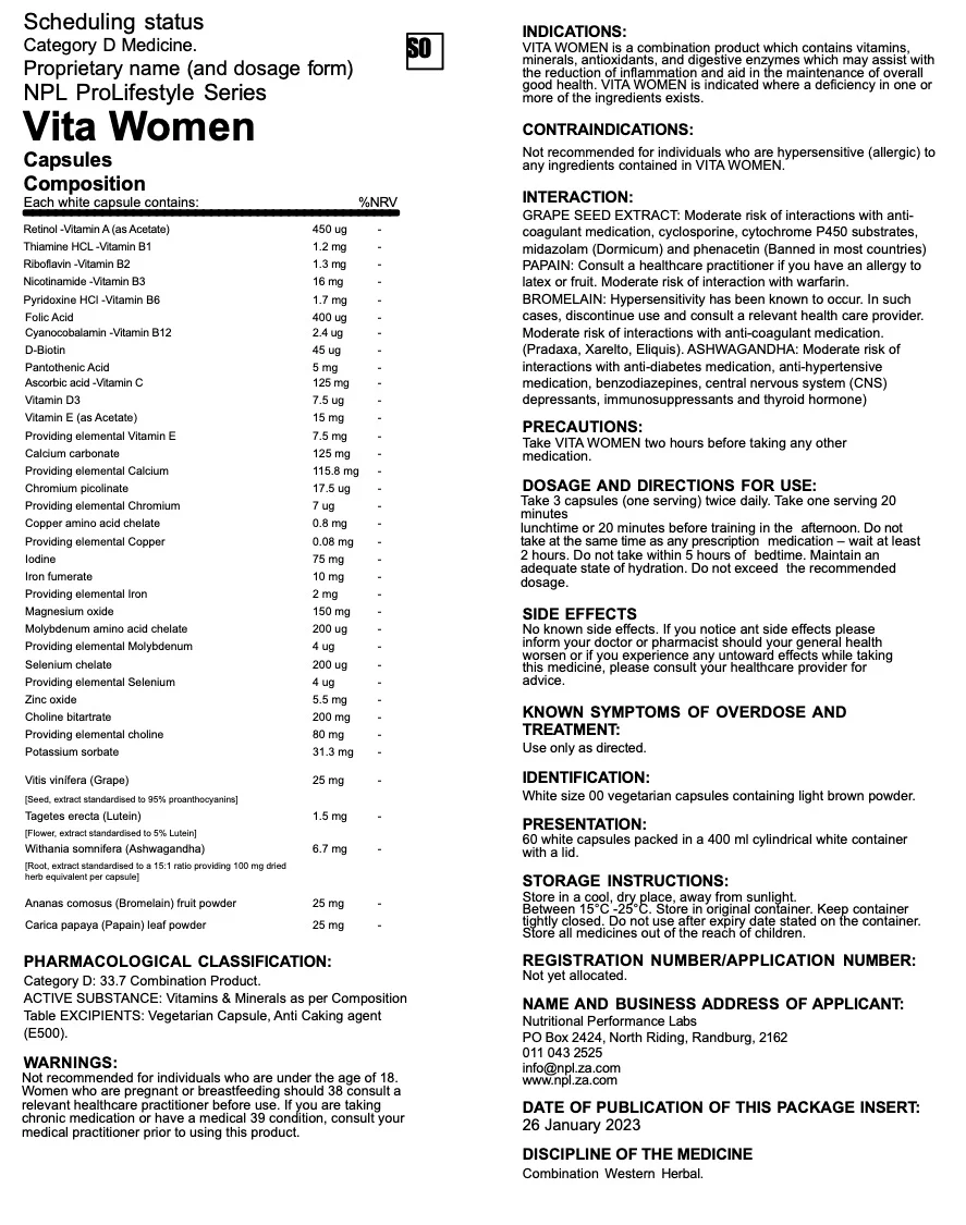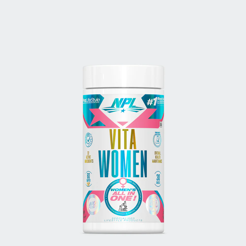 Vita Women is a premium multivitamin designed to meet the unique nutritional needs of women. Packed with essential vitamins, minerals, antioxidants, and hormone-supporting nutrients, it promotes steady energy, healthy skin and hair, immune strength, and overall wellbeing. Whether you’re training, balancing a busy lifestyle, or simply prioritizing your health, Vita Women fills daily nutritional gaps and helps you feel strong, energized, and supported from the inside out.